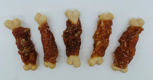 Mini-Bones mit Hähnchenfilet sind eine perfekte Mischung aus zart und hart. Die relativ harte, mit Calcium angereicherte Kaustange ist mit zartem Hähnchenfilet umwickelt. Sehr fettarm (2,0% Fett), ca. 5-7cm lang, ca. 10-12g schwer und schonend heißluftgetrocknet. Der glutenfreie Kaugenuß für kleine Rassen. Gibt es auch als Mini Bones mit Entenfilet
