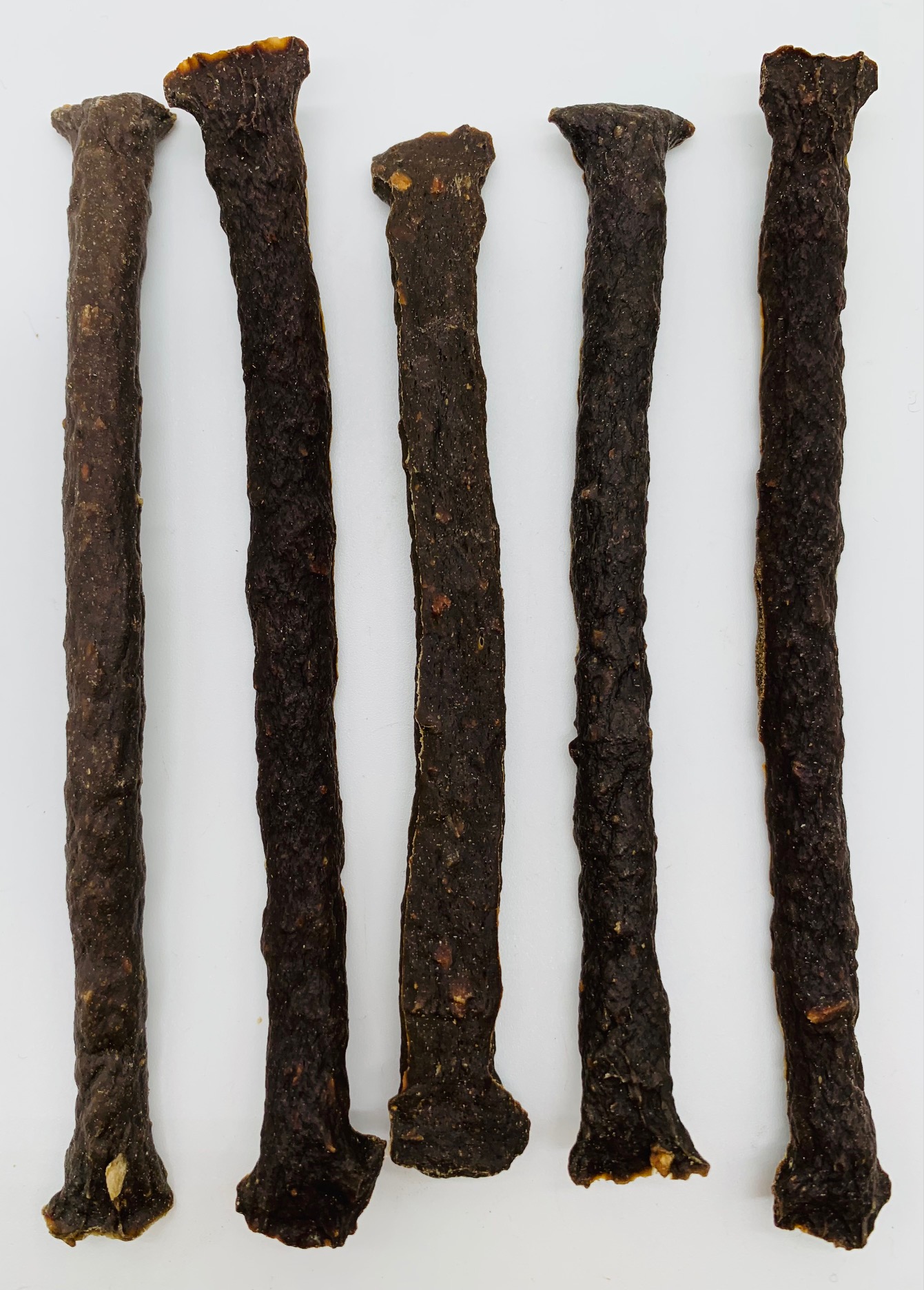 Diese sehr hochwertigen, mittelharten und schmackhaften Fleisch-Sticks sind ca. 12-14 cm lang, 100g entsprechen ca. 14-16 Stück.