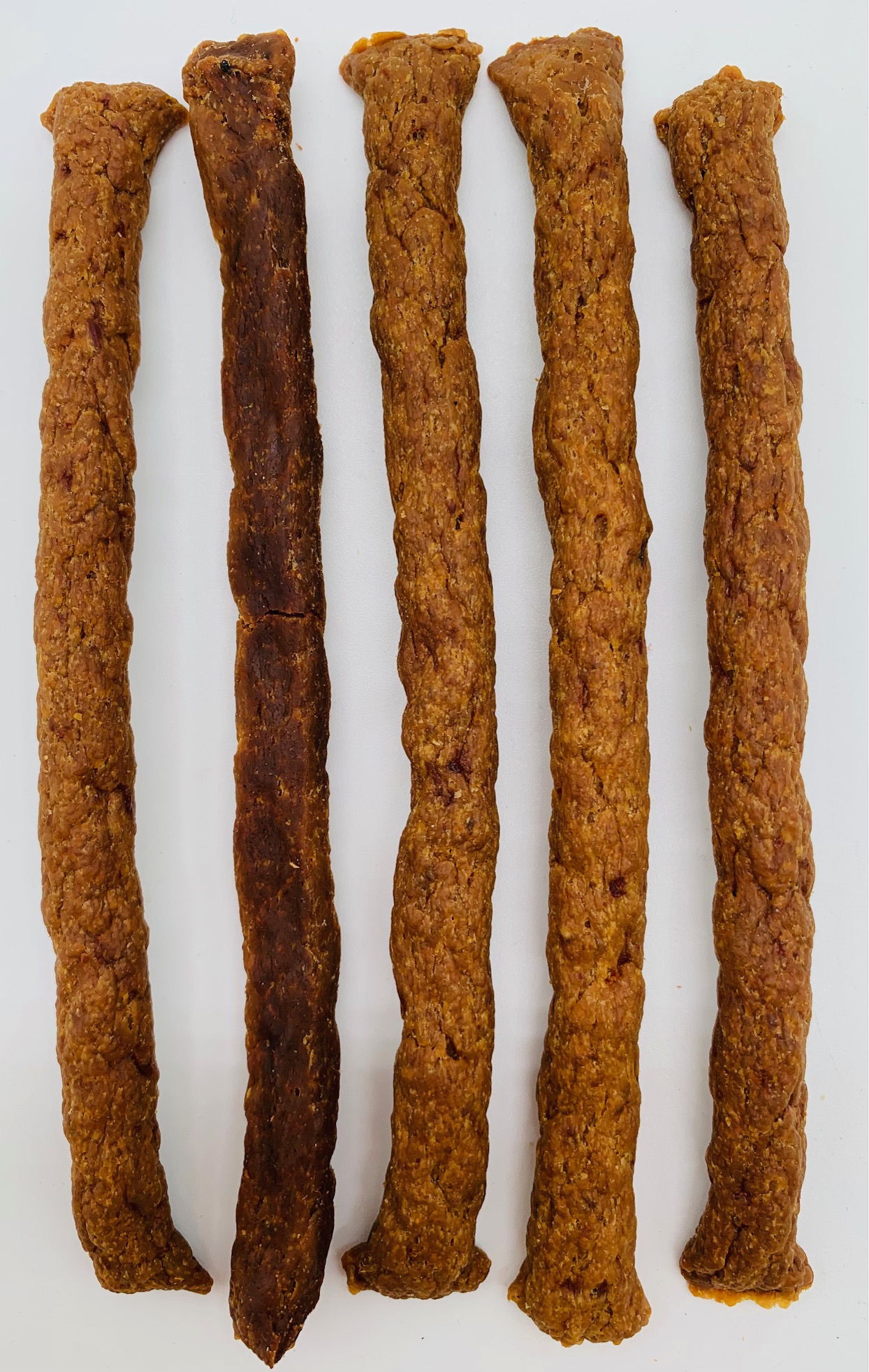 Diese sehr hochwertigen, mittelharten und schmackhaften Fleisch-Sticks sind ca. 12-14 cm lang, 100g entsprechen ca. 14-16 Stück.